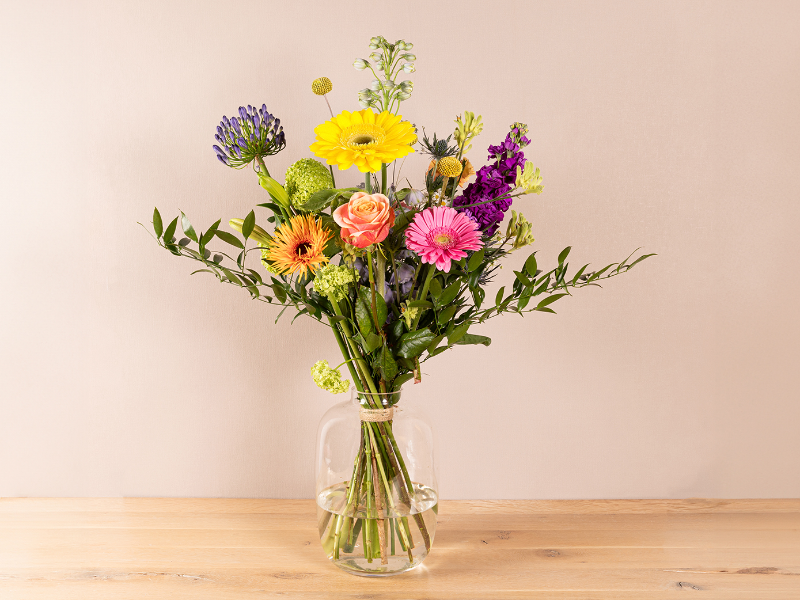 Vrolijk plukboeket in frisse tinten, losjes geschikt met speels groen en hoogteverschil.